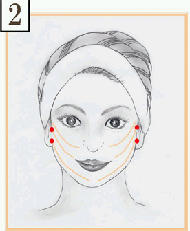 2.頬全体も、小鼻のわき・口元・下あご中央からこめかみにむかってマッサージします。