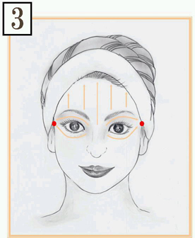 3.額は下から上へ、目のまわりはアーモンド型にこめかみにむかってマッサージします。